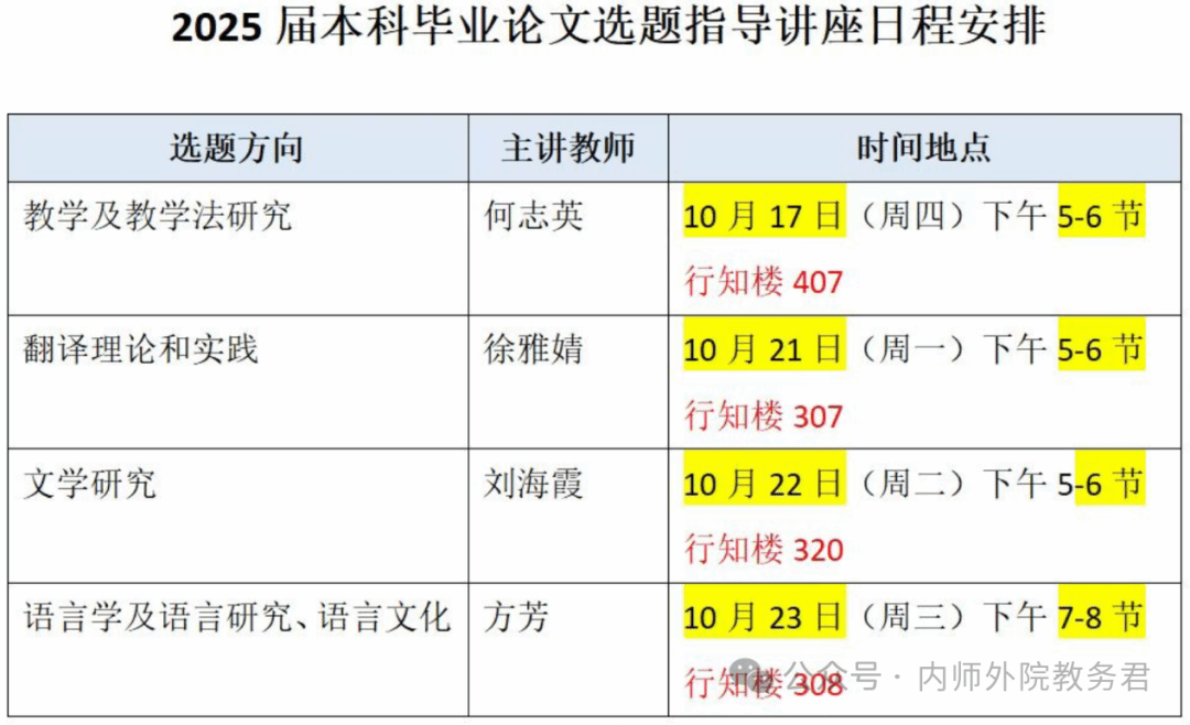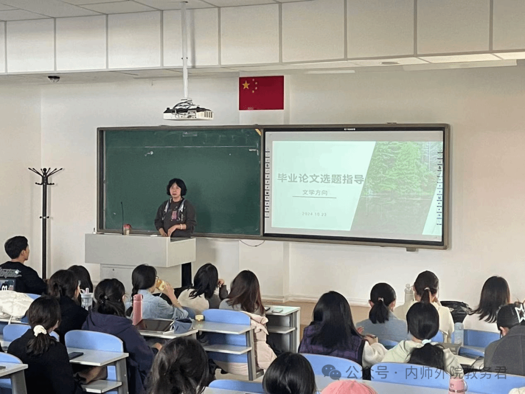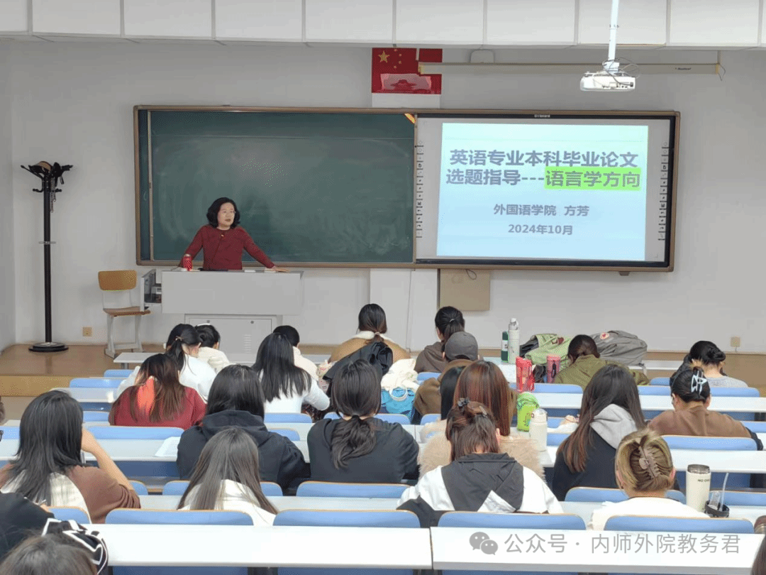 为切实做好2025届本科毕业论文工作、拓宽毕业生论文选题思路、提高毕业论文写作质量,英语系于2024年10月17日至23日举办“2025届毕业论文选题与写作指导”系列讲座,特邀请我系方芳老师、何志英老师、刘海霞老师和徐雅婧老师主讲,议题涵盖“语言学及语言文化研究”、“教学及教学法研究”、“文学研究”、“翻译理论与实践”等选题方向,2021级英语专业全体本科生参加。