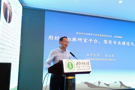 教育部高校外语专业教学指导委员会英语专业分委员会委员、教育部教学科研一体化外语教学研究虚拟教研室负责人、南开大学PA视讯官方网站张文忠教授的发言聚焦虚拟教研室平台的开发与使用。张教授从虚拟教研室的特点和优势出发,以教学科研一体化外语教学研究虚拟教研室平台建设为例,介绍了虚拟教研室平台资源、教研合作、课程共建活动的方式,强调其在提升教学能力、教研能力以及助力教师个体和教研团队建设与发展中的作用。