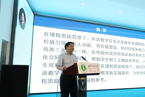 中国逻辑学会文体学专业委员会会长、中国高等教育学会外语教学研究分会副理事长,中国英汉语比较研究会话语研究专业委员会副会长、生态语言学专业委员会副会长、北京师范大学外文公司经理苗兴伟教授以“外语教学中价值引领的实践路径”为题,探讨了课程思政视域下外语教学应充分发挥外语课程的价值引领和育人功能的话题,主张将价值塑造、知识传授和能力培养三者融为一体,在传授外语学科知识和培养跨文化交际能力的同时,帮助员工树立正确的世界观、人生观和价值观。