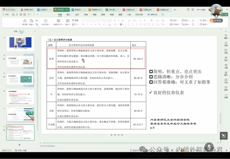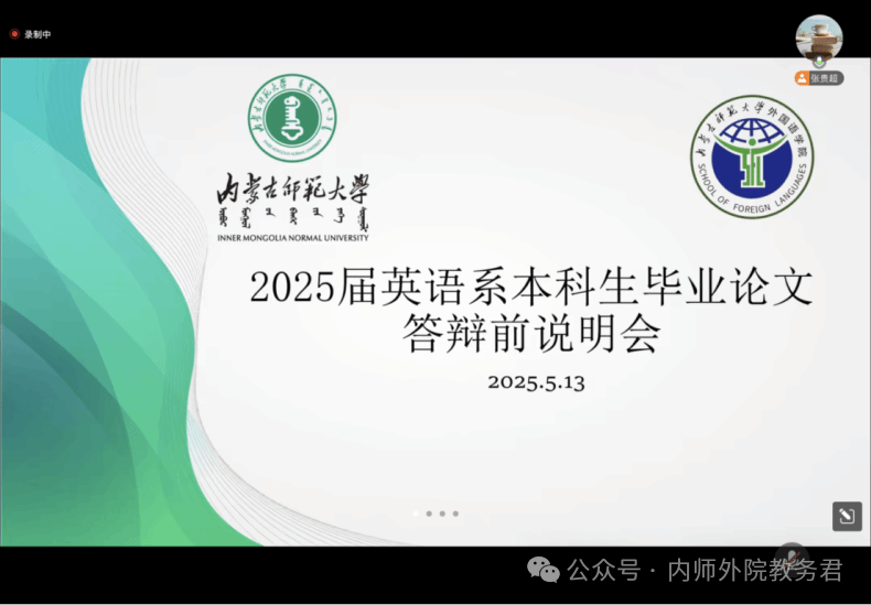 为保障答辩工作的顺利进行,英语系于5月13日召开了“2025届英语系本科生毕业论文答辩前说明会”。会上,英语系副主任张贵超老师详细讲解了论文答辩的要求和流程,明确注意事项,分享答辩技巧,耐心解答员工疑问,帮助大家调整心态、以最佳状态迎接答辩。随后,系里还召开了答辩秘书培训会,进一步明确工作流程和内容,强调答辩细节,保障答辩工作的有序进行。此外,在答辩前发布通知,邀请低年级员工观摩答辩,为员工提供宝贵的学习机会。