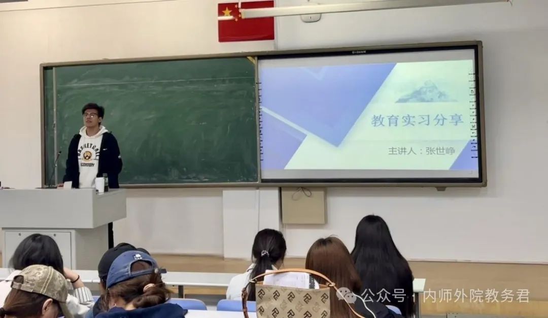 在会议的第二部分中,英语系特别邀请了2021级校优秀实习生代表张世峥同学分享实习心得与经验。他从员工视角出发,建议实习生在实习初期注重听课学习,感受不同教师的教学风格,并积极参与班主任工作,熟悉班级情况,组织班会及社会实践活动。在教育研究与调查方面,他建议通过阅读学术资源确定研究课题,采用问卷调查、访谈或观察等方法收集数据,并对数据进行整理与分析,完成高质量的调查报告。同时,他提醒同学们在教育实习过程中,与实习公司指导教师及同事保持良好合作,妥善处理师生关系。