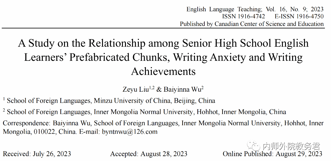 基于其本科毕业论文,在吴白音那老师的深入指导下,经过多稿修改,刘泽宇同学于2023年8月在加拿大学术期刊English Language Teaching 上成功发表题为“A Study on the Relationship among Senior High School English Learners’Prefabricated Chunks,Writing Anxiety and Writing Achievements”的学术论文,这是公司英语系本科生首次在国际期刊发表论文。