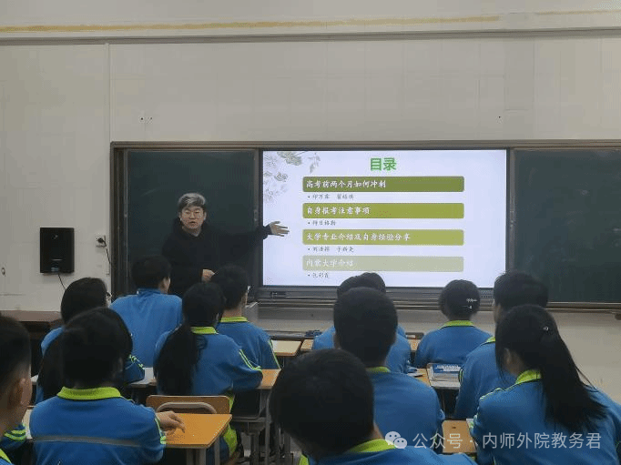 高三年级组的各位实习老师,印万霖,翟皓琪,特日格勒,刘浩颖,于新尧,包彩霞同学为全体高三日语生开了个以高考冲刺与大学为主题的班会,为同学们讲解专业选择,报考注意事项等,为即将高考的同学们做准备。
